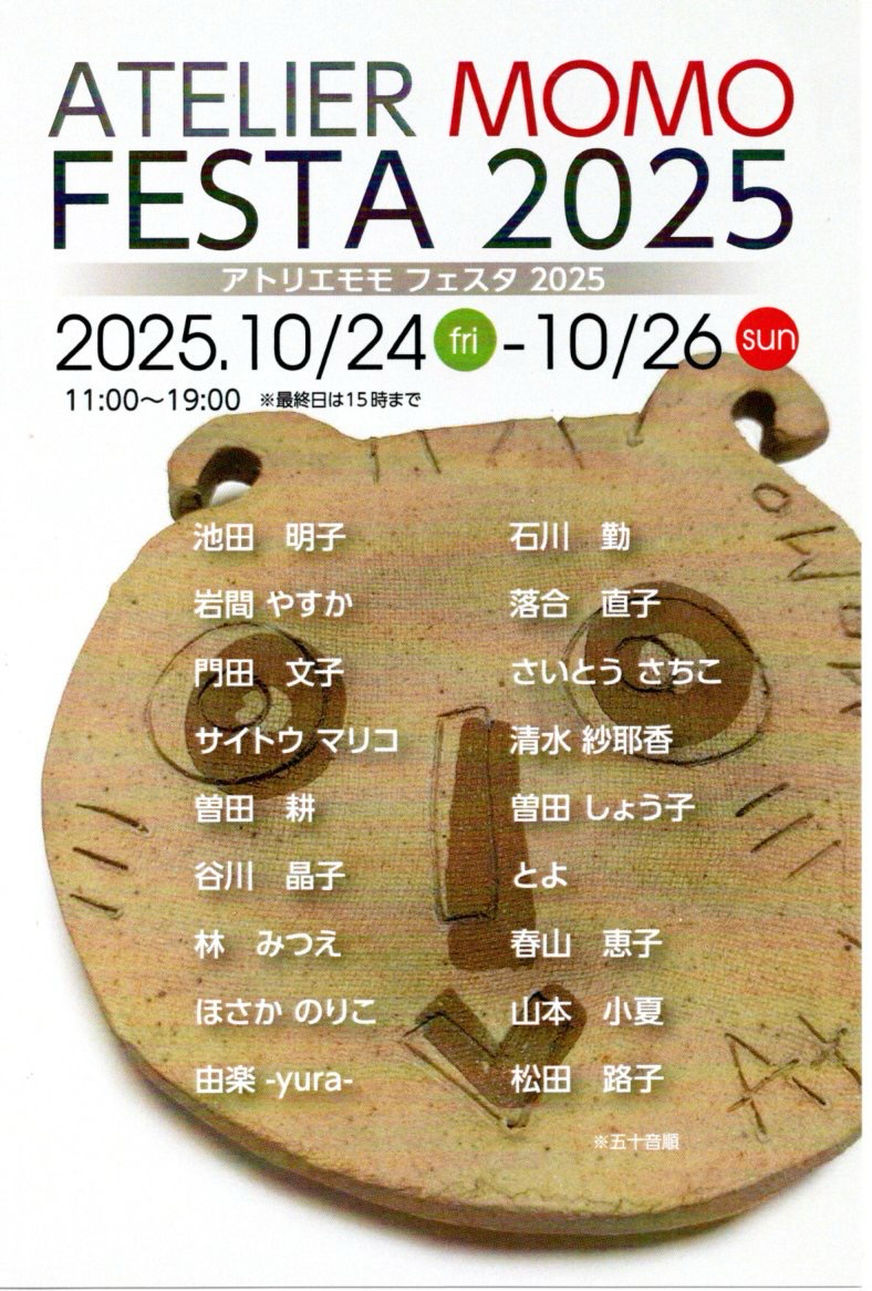 ATELIER MOMO FESTA 2025 開催日2025年10月24日(金) 〜 10月26日(日)時間11:00~19:00(最終日は15:00まで)内容掘り出し物陶器市 / MOMO CAFE